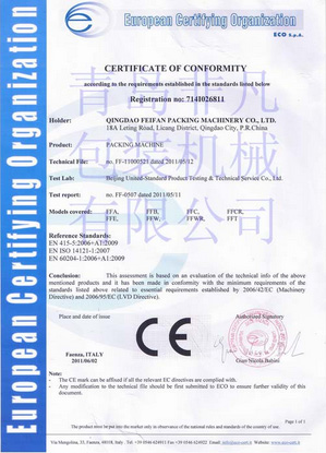 CE證書的獲得標志著青島非凡包裝機械有限公司取得了順利進入歐盟及歐盟自由貿易協會國家市場的通行證,為公司海外包裝機市場的開拓奠定了基礎;同時也標志我公司的包裝機品質又上了一個新臺階。